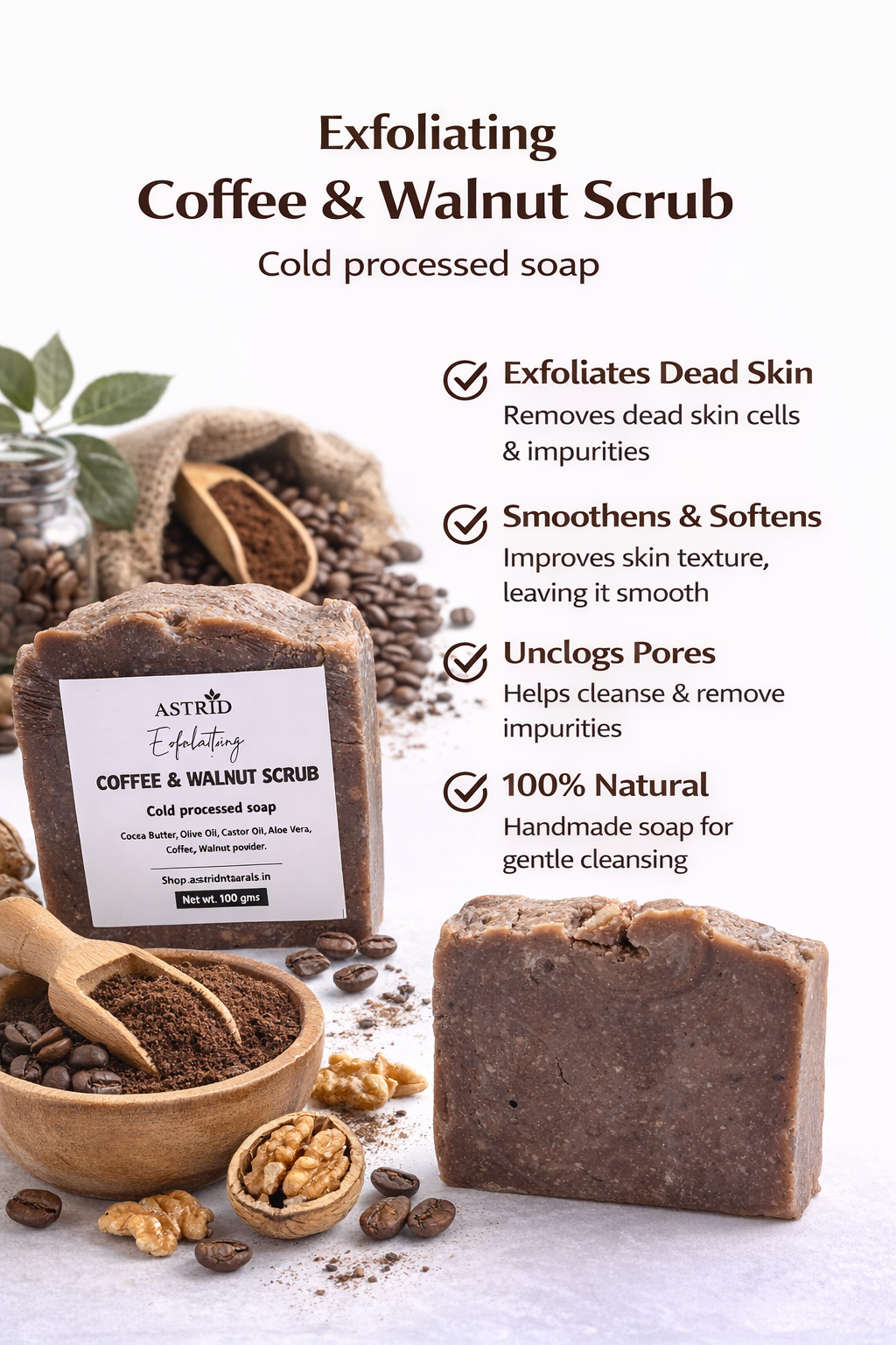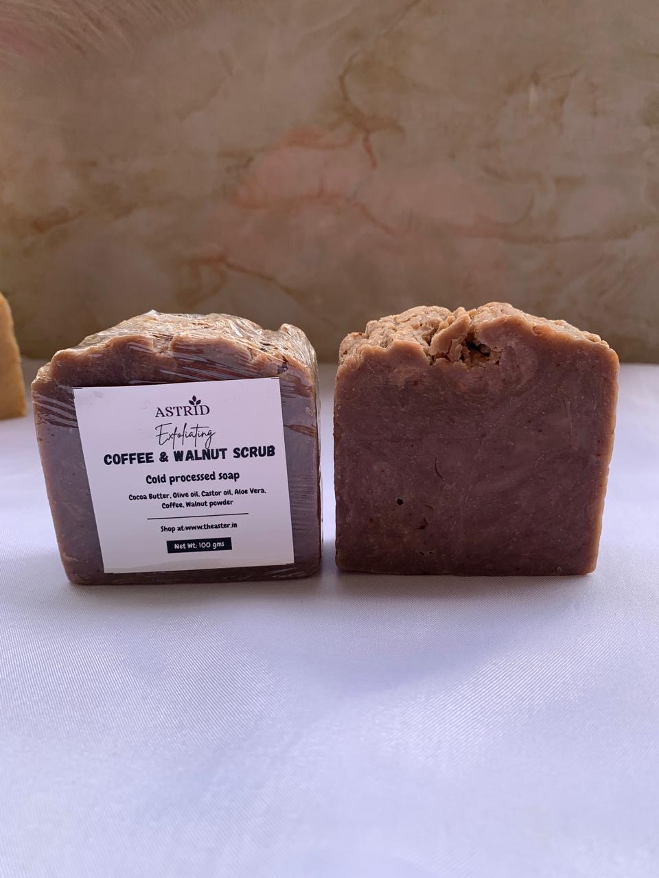 "ASTRID Coffee & Walnut Scrub Soap is a handcrafted cold processed exfoliating soap designed to revive dull skin and improve texture naturally. Finely ground coffee and walnut powder provide effective yet gentle exfoliation, helping remove dead skin cells, reduce tan buildup, and promote smoother, healthier-looking skin. The cold process method preserves natural glycerin, ensuring the soap exfoliates without leaving skin dry or irritated. Enriched with cocoa butter, olive oil, castor oil, and aloe vera, this soap nourishes the skin while cleansing deeply, making it ideal for normal to oily skin and rough body areas. Best suited for body use, ASTRID Coffee & Walnut Scrub Soap leaves skin feeling refreshed, smooth, and revitalized after every wash."