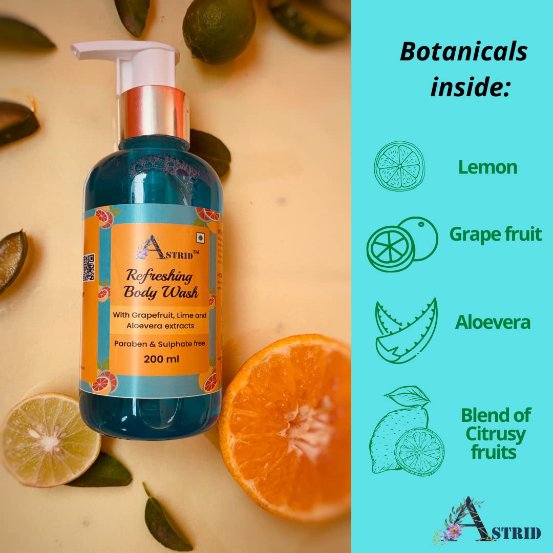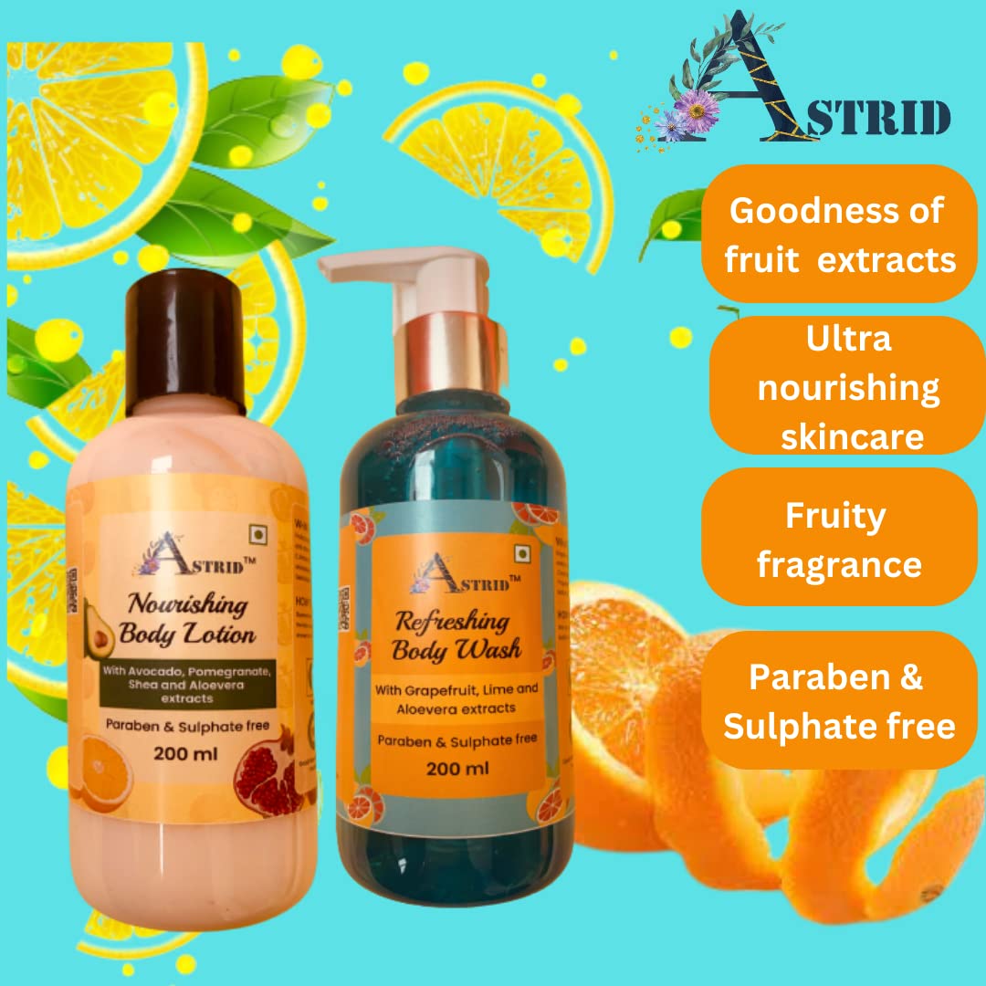 Astrid fruit Body lotion formulated with rich fruit extracts, Aloevera and Vitamin E that provides 72 hours of hydration is any season including winters. Body lotion has fruity fragrance and super light texture that provides an instant hydration to body and repairs the dry skin. Astrid body wash is a paraben and sulphate free formulae with goodness of real fruit extracts that gently cleanse skin and keepy it refreshed and hydrated.
