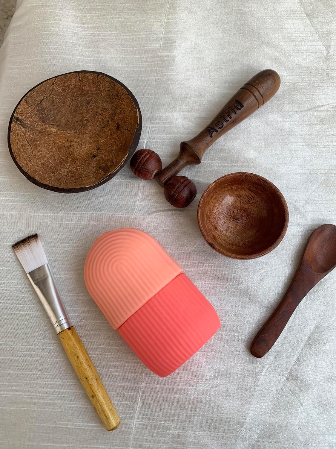 Premium Skincare & Self-Care Set - Coconut Shell Bowl, Wooden Bowl, Wooden Spoon, face care brush, ice roller, and Wooden Massager Enhance your skincare and self-care routines with our meticulously crafted Premium Skincare & Self-Care Set. This set includes six high-quality items designed to provide a luxurious and effective experience. Whether you're mixing face masks, applying treatments, or indulging in a relaxing massage, this set has everything you need. 1.A large coconut shell bowl. 2.A small wooden bowl. 3.A wooden double-ball massager 4.A wooden spoon. 5.A face mask mixing brush. 6.Ice roller
