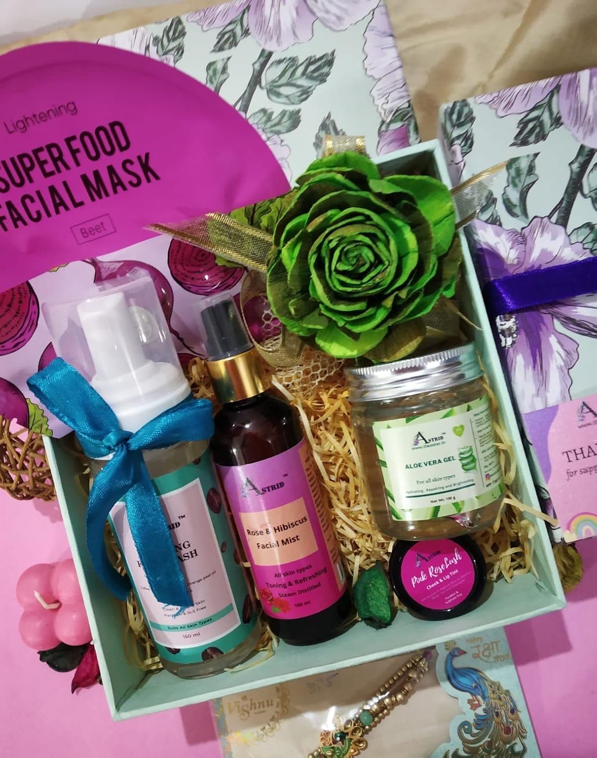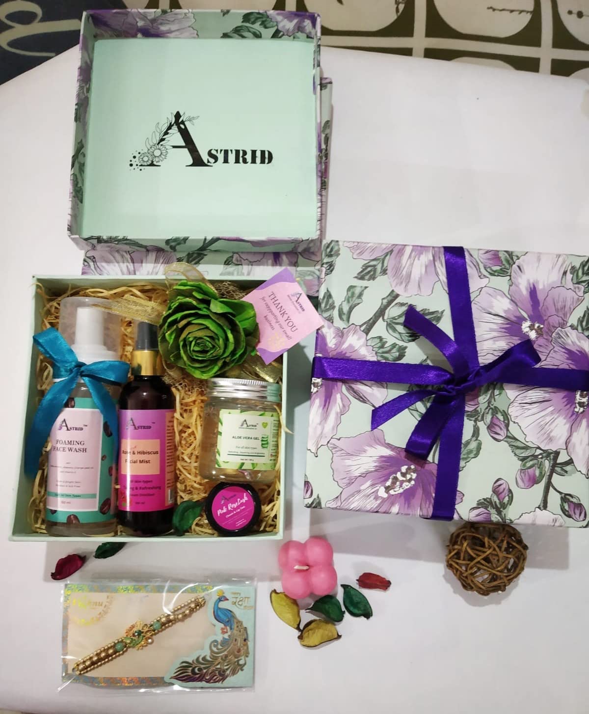 Selfcare Hamper with Six items-Foaming Face wash, Rose and Hibiscus water, Aloevera gel, Pink Lush lip balm, Sheet mask, Rakhi. Product comes in a beautiful fancy box and with a small greeting card