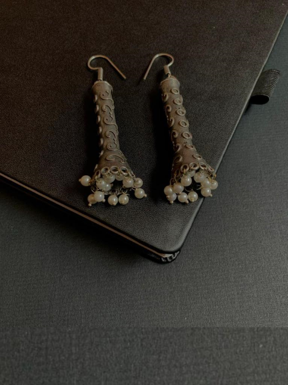 Combo of a stud and dangler. These gorgeous earrings are quite different from other boring oxidised silver earrings. The branch earring has got a pearl to give it a more refined and detailed look. These earrings are great option for work from home look.